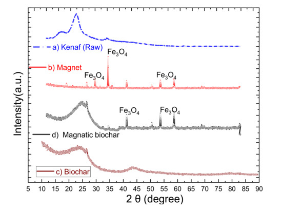 Figure 6 shows the XRD analysis performed over the range of 2θ = 10°–90° to classify the crystallographic structure changes of biochar, magnetic biochar, and the raw materials (kenaf and magnet). The XRD data (Figure 6d) shows that the magnetic biochar was amorphous, so the magnetite ores were loaded on the surfaces of the biochar. Amorphous biochar, which probably had a relatively homogeneous structure, could prevent the aggregation of the magnet nanoparticles and, therefore, maximize the adsorption capacity. According to Kang et al. [72], a good adsorption capacity is achieved by using amorphous adsorbent. Due to the thermochemical reactions between iron and carbon during pyrolysis, the amorphous carbon peak in the magnetic biochar pattern weakened greatly, resulting in a macrocrystalline graphite crystal lattice flaw. The magnetic biochar pattern’s characteristics peaks at 42.5°, 50.4°, 53.7°, and 57.8° show the presence of Fe in the biochar. The Fe3O4 phase was strongly crystalline and deposited on the composite’s surface, as shown by the sharpness of the XRD peaks, and these findings are in agreement with studies done by Hongwei et al. [73] and Tassya et al. [74].