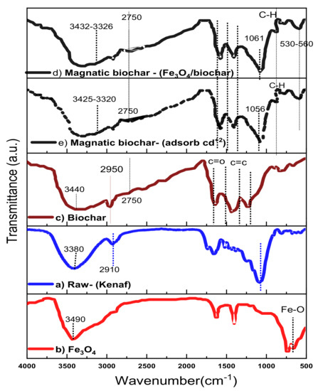 Figure 7. FTIR spectra of (a) kenaf (raw), (b) Fe3O4, (c) biochar, (d) magnetic biochar, and (e) magnetic biochar (after Cd(II) adsorption).