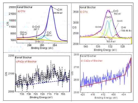 Figure 9. XPS analysis of the magnetic biochar by showing (a) C1s spectrum, (b) O1s spectrum, (c) Fe2p spectrum, and (d) Cdp2 spectrum.