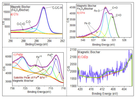 Figure 9 shows the XPS analysis of magnetic biochar spectra C1s spectrum, O1s spectra, Fe2p spectrum, and Cdp2 spectrum. The C1s spectrum and O1s spectra indicate that the carbon percentage decreased and oxygen percentage increased after the impregnation of biochar with iron. Figure 9c displays XPS spectra with high resolution, revealing the existence of Fe2p1/2 at 715.5–725 eV and Fe 2p2/3 at 711–714.5 eV. These findings demonstrate the presence of Fe3+ and Fe2+, which appeared as a result of mixing biochar with iron oxide. Satellite peaks of Fe3+ and Fe2+ were found at the range of binding energy of 715–720 eV, which is similar to the results of Naeemeh et al. [80] and Haixia Wu et al. [81]. Figure 10c shows that after adsorption of Cd(II), there was a significant displacement of Fe 2p binding energy, implying the occurrence of coordination reactions between Fe and Cd.