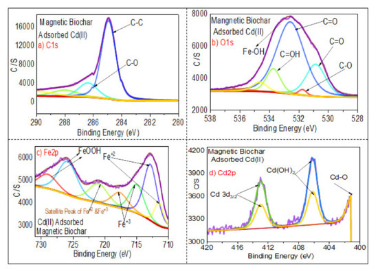 Figure 10 shows the broad peaks of magnetic biochar (after adsorption), C1s spectrum, O1s spectrum, Fe2p spectrum, and Cdp2 spectrum. In comparison to the O1s spectrum of the pristine biochar (Figure 8b) showing the presence of oxygen in the form of organic oxygen (C–OH)/C–O–C) and inorganic oxygen (Fe–O/Cd–O), Figure 10b shows strong peaks in the O1s region, indicating several chemical states of oxygen such as organic oxygen (C–OH)/C–O–C) and inorganic oxygen (Fe–O/Cd–(C–O–C). Meanwhile, Figure 10d shows that the Cd 3d3/2 core-level spectrum has two peak components with binding energies of about 413.5 eV, 406 eV, and 402 eV, which can be attributed to Cd–O and Cd (OH)2 species, respectively. The findings show that Cd(II) deposition and chelation played a significant role in the adsorption mechanism [82].