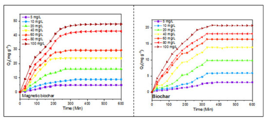 The kinetics study was applied to Cd2+ adsorption using the biochar and the magnetic biochar. Figure 11 shows the evolution of adsorption as function of time under initial Cd2+ concentrations (of 5, 10, 20, 40, 60, 80, and 100 mg L−1). The Cd2+ adsorption onto the biochar and the magnetic biochar rapidly improve in the first two hours but at different rates. The adsorption on the magnetic biochar in the first two hours reaches double the adsorption on the biochar. Overall understanding from Figure 11 indicated that most of the Cd2+ ions could be adsorbed within 4 h until reaching the equilibrium when the internal active adsorption sites were fully occupied. The magnetic biochar adsorbed Cd2+ more than the biochar, even in the same period, suggesting that it had better adsorption properties than the biochar. The surface area and pore volume of magnetic biochar was greater than the surface area and pore volume of biochar of 175.55 m2 g−1, 0.102366 cm3 g−1, and 117.70 m2 g−1, 0.063884 cm3 g−1, respectively.