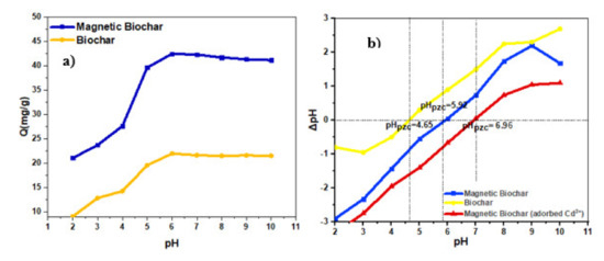 pH is one of the significant parameters that influence the adsorption capacity. The adsorption capacity might be influenced by pH in different aspects: concentration of metal ions or electrical surface charge on the adsorption [87,88]. The range of pH was between 2.0–10 to study the influence of pH on adsorption capacity, while the other parameters were kept constant. Figure 12a shows the effect of the solution pH on the adsorption of Cd2+ on the magnetic biochar and the biochar. The trend indicated that the adsorption capacity for both adsorbents increases as pH increased to 6, then it slightly decreased. The adsorption capacity of magnetic biochar and biochar was 9.65 mg g−1 and 21.1 mg g−1, respectively, at pH 2.0, and later reached the maximum value of 43.92 mg g−1 and 22 mg g−1, respectively, at pH value 6.0. The high adsorption capacity of adsorbents on cadmium ions occurred around pH ranging from 5.5 to 6.0. This happened because the surface of biochar becomes saturated with hydrogen ions at lower pH levels, and this saturation prevents the removal of cadmium ions owing to the mutual repulsion between cadmium and hydrogen ions [89,90]. Above pH 6.0, cadmium precipitation usually occurs. This is because insoluble cadmium hydroxides such as Cd (OH)2 and Cd (OH)3- begin to precipitate out of solution at higher pH values. This must be avoided to discriminate between sorption and precipitation [90].