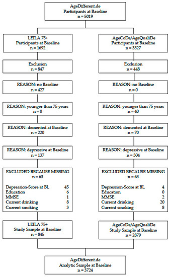 The present study includes data on covariates and predictors assessed at baseline and information on depression severity up to the last follow-up of both studies (AgeCoDe: follow-up 9) observation period of up to more than 13 years; LEILA 75+: follow-up 6 (observation period of up to more than 16 years). Of the overall sample, 427 (8.51%) participants did not complete the baseline assessment and another 40 (0.8%) participants were younger than 75 years of age and therefore excluded. We further excluded 290 (5.78%) participants with a diagnosis of dementia at baseline, as well as 441 (8.79%) participants with a diagnosis of depression at baseline, identified by accepted cut-off values for the CES-D and for the GDS-15 (reported in detail below). Further, participants with missing data in depression score and relevant covariates at baseline were excluded (n = 97, 1.94%). The final analytical sample consisted of 3724 participants; a flow chart is depicted in Figure 1.