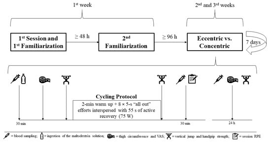 This study consisted of six laboratory visits over three weeks, with the activities completed on each visit as follows: (1) anthropometric evaluations, graded cycling test and initial familiarization with eccentric cycling; (2) familiarization of the concentric and eccentric protocols, including functional performance testing and perceptual scales; and (3–6) experimental interventions consisting of concentric and eccentric protocols and a 24-h follow-up measurement in a randomized order. The first and second visits occurred in the same week with a minimum of 48 h between sessions, while the experimental sessions and their corresponding recovery assessments were carried out one week apart. Measurements included functional performance (vertical jump and handgrip strength), perceptual measures (rating of perceived exertion [RPE], feeling scale [FS], visual analogue scale [VAS] and session RPE [sRPE]), thigh circumference, and blood markers of muscle damage (CK, MMP-13, and BAG3). To avoid circadian influences, all evaluations were completed at the same time of the day, between 7:30 and 9:30 a.m. The study design is presented in Figure 1.