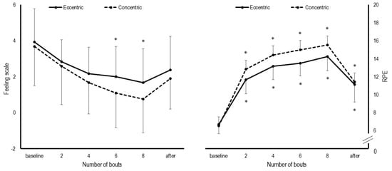 The evolution of perceptual responses during the cycling protocols are shown in Figure 2. The RPE statistically increased throughout all time points during both concentric (d = 2.624 to 6.981; p < 0.05) and eccentric protocols (d = 2.849 to 5.658; p < 0.05). In the eccentric protocol, statistical increases in the FS were observed following the 6th (p = 0.030, d = 1.261) and 8th bouts (p = 0.016, d = 1.438). In the concentric one, FS remained statistically unaltered throughout the loading (d = 0.506 to 1.438; p > 0.05). There was no statistical difference for sRPE between concentric and eccentric sessions (5.2 ± 1.7 vs. 4.4 ± 1.5, p = 0.08, d = 0.473).