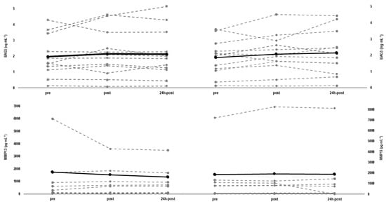 When interpreting our findings, a limited validity of BAG3 and MMP-13 for measuring the acute muscle damage must be acknowledged. This is particularly attributed to a high biological variability, probably associated with their multiple functions for proteostasis during different phases of recovery from EIMD [24,46], but also because concentrations of these markers were not directly obtained from muscle biopsies as in previous studies [23,25]. However, our analysis indicated an acceptable reliability for basal values, indicating these markers to be relatively stable in serum. Moreover, the statistical associations between the changes in BAG3, MMP-13, and CK would reinforce the suitability of these markers and, at the same time, indicate these markers as potential targets for further studies evaluating EIMD after eccentric protocols. Therefore, future studies should explore the sensitivity of these specific markers to monitor different facets of muscle damage over time.