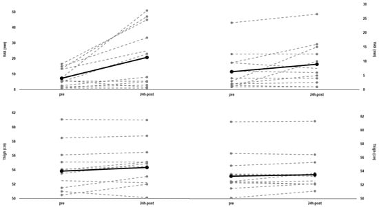 VAS statistically increased 24-h after eccentric cycling (from: 7.39 ± 5.44 to 20.71 ± 18.48, p = 0.016, d = 2.969), while it nearly reached statistical significance 24-h after concentric cycling (from: 6.33 ± 6.37 to 8.92 ± 7.23, p = 0.065, d = 0.517). The thigh circumference remained unchanged 24 h after concentric cycling (∆pre-24 h-post: +0.44 ± 0.95%, p = 0.159, d = 0.073), but increased 24 h after eccentric cycling (∆pre-24 h-post: +0.97 ± 1.45%, p = 0.045, d = 0.152). Both VAS and thigh circumference changes are shown in Figure 4 on an individual basis.