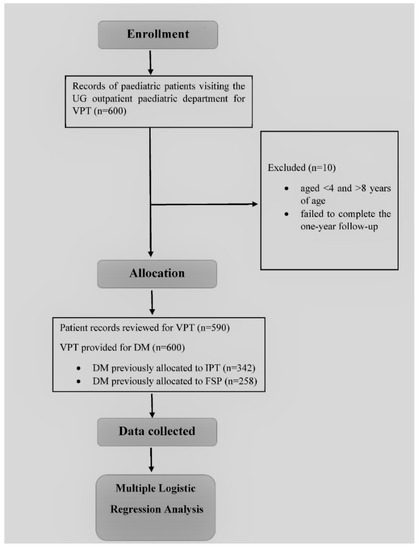 The study was conducted in accordance with the Declaration of Helsinki, and ethical approval was obtained from the Human Research Ethics Committee of Universiti Sains Malaysia (USM) for this study (USM/JEPeM/19060358). This was a retrospective, record-review study. Purposive sampling, which is also known as judgmental, selective, or subjective sampling, was used in this study. A study sample of 590 pediatric patient records (350 males, 240 females) with 600 VPT-treated DMs in the last five years (starting from 1 September 2013 until 2 May 2018) were collected from the Records Unit, Hospital USM.