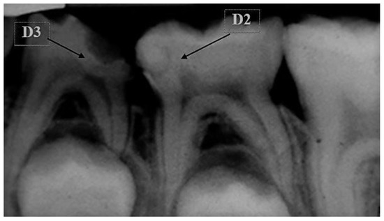 A comprehensive clinical consultation to assess the carious DM was carried out by UG students. Then, the radiographic examination was undertaken, which included bilateral bitewings and periapical radiographs to assess the caries extension on the teeth in question. A discussion was carried out between the UG student and a pediatric dental-specialist tutor to determine the type of VPT that was more indicated for the DM. If the clinical signs and symptoms conferred with a reversible pulpal injury, and no periapical or periradicular radiolucency was present radiographically, the tooth was allocated for either an IPT or an FSP [9]. Furthermore, the depth of caries was analyzed radiographically to choose between an IPT or FSP, following the American Dental Association Caries Classification System [15], as illustrated in Figure 2. Therefore, if the radiolucency was at or beyond a D2 level, the patient was allocated for an IPT, and if the radiolucency extended to a D3 level and involved the pulp chamber, the patient was allocated for an FSP.