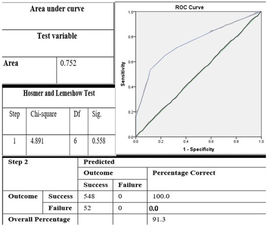 The final established model for variables significantly associated with treatment outcomes of VPT is shown in Table 3. Table 3 shows the final logistic regression model comparing the crude and adjusted OR and the elimination of the insignificant variable. Figure 3 shows the goodness of fit of the final model, which justifies the credibility of our model by fulfilling three necessary assumptions (namely the Hosmer–Lemeshow ratio, the classification table, and the area under the ROC curve). The insignificant variables were eliminated. According to the variable type of DM, with second DM as a reference, the OR was almost four times that of the first DM. According to arch type (i.e., maxilla vs. mandible), with maxillary arch as the reference, the OR was almost three times that of the mandibular arch. For type of treatment, with IPT as a reference, the odds ratio (OR: (95% CI)) was approximately twice that of FSP. Lastly, according to surfaces involved, there was no association between the number of surfaces involved and treatment outcome, so this variable was eliminated.