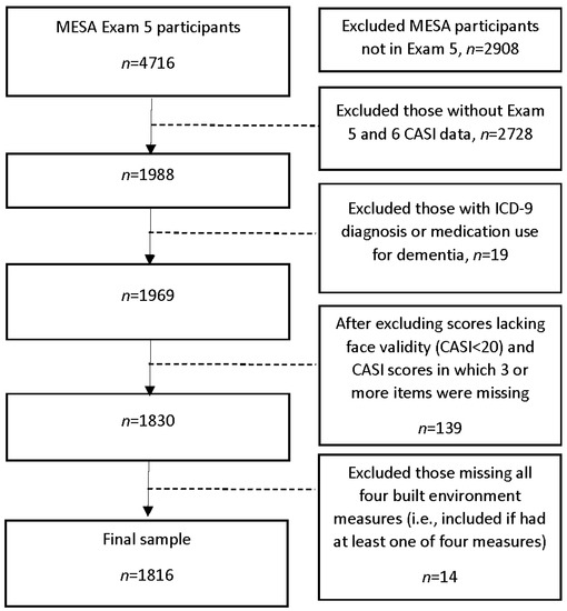 - Besser, L.M.; Rodriguez, D.A.; McDonald, N.; Kukull, W.A.; Fitzpatrick, A.L.; Rapp, S.R.; Seeman, T. Neighborhood built environment and cognition in non-demented older adults: The Multi-Ethnic Study of Atherosclerosis. Soc. Sci. Med. 2018, 200, 27–35. [Google Scholar] [CrossRef] [PubMed]