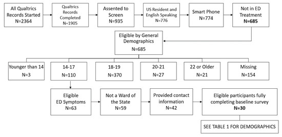 - Fitzsimmons-Craft, E.E.; Balantekin, K.N.; Graham, A.K.; DePietro, B.; Laing, O.; Firebaugh, M.-F.; Smolar, L.; Park, D.; Mysko, C.; Funk, B.; et al. Preliminary data on help-seeking intentions and behaviors of individuals completing a widely available online screen for eating disorders in the United States. Int. J. Eat. Disord. 2020, 53, 1556–1562. [Google Scholar] [CrossRef]