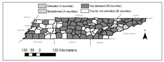 In this context, we developed a collaborative tick-surveillance network for the state of Tennessee, which included academic, government, and other stakeholders, with the primary goals of (a) developing a comprehensive tick-surveillance program to detect this species as soon as possible, (b) using those tick collections to develop educational materials for stakeholders and researchers, and (c) documenting the early and first detection of H. longicornis in multiple Tennessee counties. Here we report on our collaborative efforts to identify both established and detected populations of H. longicornis in Tennessee (March 2019 to February 2020). Additionally, we report identification as morphological and genetic confirmation and determine the potential presence of animal pathogens within the collected ticks with molecular testing. Before this study, H. longicornis had not yet been detected in Tennessee, but it was identified in nearby states of North Carolina, Virginia, and West Virginia, and several researchers predicted that populations will expand across North America into Tennessee and westward into Arkansas [14,15,16]. When our study began (March 2019), known hosts of H. longicornis in the US were 17 wild and domestic mammal species and one hawk (a mammalian predator) [1,12]. Additionally, ticks had been collected from vegetation in yards, parks, pastures, and forested areas [12,16].