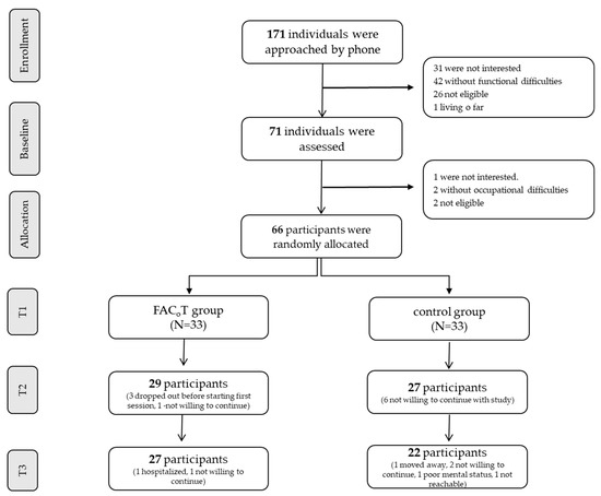 In total, 29 participants from the FaCoT group completed the intervention and were assessed at T2, and 27 of them completed T3. The low dropout rate was seen in the control group as well (Figure 1).