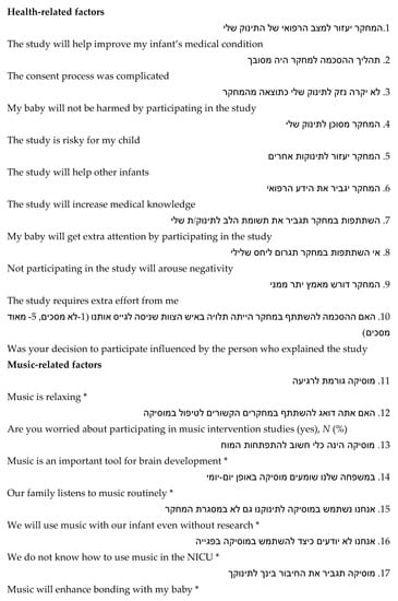 A 17-item questionnaire on MT studies was developed for this study (Figure 1) to gather information on parental reasons for consenting or refusing for their preterm infant to participate in MT intervention research while hospitalized in the NICU, as well as parental attitudes towards MT dedicated to premature infants during their NICU stay. The questionnaire was written in Hebrew and included general questions about reasons to participate in a study involving preterm infants and specific questions concerning participating in MT intervention studies involving preterm infants.