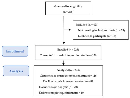 The initial sample of those who were approached to participate in MT studies consisted of 265 families, of whom 223 (84%) completed the questionnaire on parental attitudes toward consent for music intervention studies. Among 142 (53%) who consented to MT intervention studies, 126 (89%) completed the questionnaire, and of 123 (47%) who refused to participate, 97 (79%) completed the questionnaire. No statistical difference was noted between those who consented to those who refused to participate in the MT intervention studies (p = 0.76). The study flow diagram is depicted in Figure 2. Twenty families were excluded from the final analysis (10 in each study group) due to incomplete questionnaires (n = 10) or disagreement between parents (n = 10).