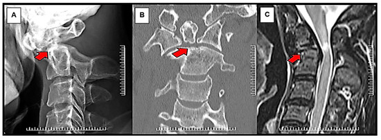 Radiographic images of nonunited type II odontoid fracture with atlantoaxial instability. Atlantoaxial instability with cervical myelopathy caused by nonunited type II odontoid fracture (Red arrows): (A) lateral plain radiograph; (B) coronal CT image; (C) sagittal MR image.