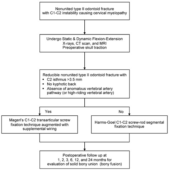 Instability of the atlantoaxial (C1-C2) joint may be the result of various pathologic processes, including degeneration, infection, inflammation, tumor, and trauma [8]. Displaced nonunited type II odontoid fracture is one of the common etiologies. It often leads to atlantoaxial instability, subsequent subluxation of the joint, and disabling neurological deficits [1,2,5]. In these cases, surgical treatment is the current standard treatment [2]. The goals of surgical treatment are to restore the alignment, decompress the neural structure and create rigid stability by performing fusion and fixation of C1-C2 vertebrae [7,9,10,11]. The surgical techniques of C1-C2 fixation, including Magerl’s C1-C2 transarticular screw fixation technique and Harms-Goel C1-C2 screw-rod segmental fixation technique, are well known among spine surgeons [9,10]. Both techniques provide strong biomechanical stability and higher fusion rates when compared to the posterior sublaminar wiring alone [11,12,13]. To further increase fixation stability and improve the union rate, an alternative technique to increase fixation stability by combining the transarticular screw augmentation with posterior supplemental wiring and fusion was proposed [14,15,16]. Previously, several studies had addressed the biomechanical properties and treatment outcomes for each fixation technique in patients with atlantoaxial instability [11]. To date, only a few studies and case reports have addressed the surgical outcomes of these fixation techniques in patients with atlantoaxial instability secondary to nonunited type II odontoid fracture.