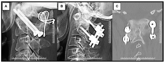 Radiographic images of patients with reducible nonunited type II odontoid fracture with myelopathy treated with (A) Magerl’s C1-C2 transarticular screw fixation technique augmented with supplemental wiring and (B) Harms-Goel C1-C2 screw-rod segmental fixation technique. Coronal CT scan imaging (C) shows C1-C2 complex screw construction with solid fusion mass in Harms-Goel C1-C2 screw-rod segmental fixation technique at 3-month follow-up.