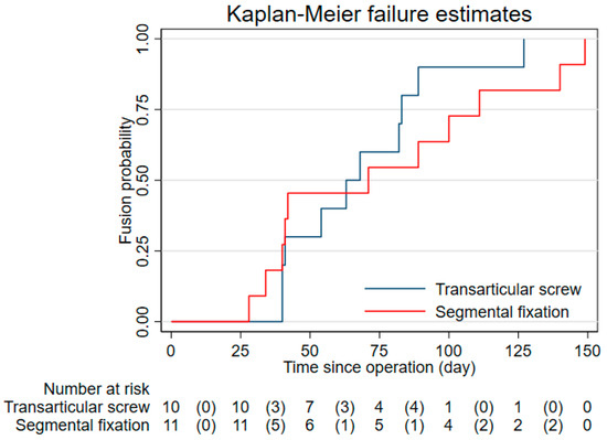Kaplan-Meier curves for fusion probability in both study groups. The blue line depicted the fusion probability of patients in Magerl’s C1-C2 transarticular screw fixation technique group. The red line depicted the fusion probability of patients in the Harms-Goel C1-C2 screw-rod segmental fixation technique group.