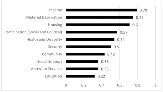 Figure 2 shows the percentage of studies that included each of the different dimensions in their multidimensional perspective. Some of the dimensions that compose economic–structural exclusion, such as income, material deprivation, housing, health and disability, were the most used. Among them, social and political participation emerged as a notable exception, a dimension belonging to sociocultural exclusion that also appears to be one of the most used.