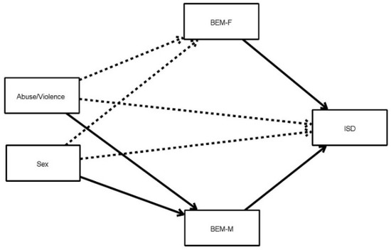 Mediational model. Categorical independent variables (factors) are shown with only one rectangle, but their effect is estimated using contrast variables. BEM-M = Male behaviors, BEM-F = Female behaviors; ISD = Inhibited sexual desire.