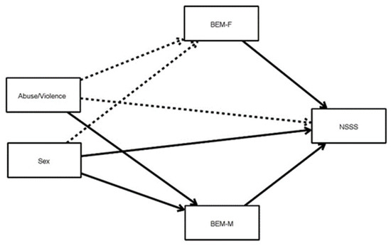 In the case of sexual satisfaction (represented in the lower part of Figure 1), male behavior (BEM-M) also mediates between abuse/violence and sexual satisfaction (NSSS) for the condition abuse/violence1 (when they answered Yes to the rest of conditions), β = 0.026. In this case, male behavior also showed mediating the relationship between sex and sexual satisfaction when sex was female (β = −0.027). Additionally, sex and female behavior showed a significant relationship with sexual satisfaction (β = −0.150 and β = 0.234, respectively); see Table 2 for more details.
