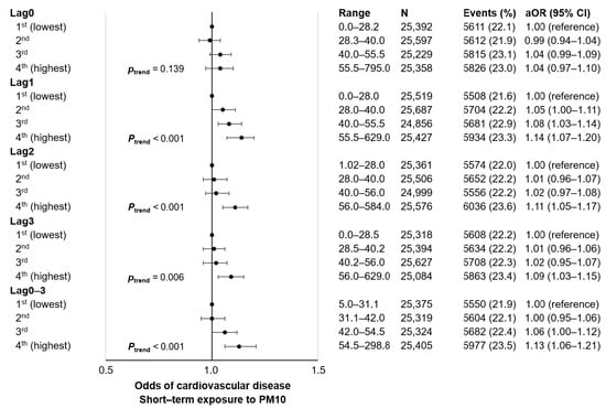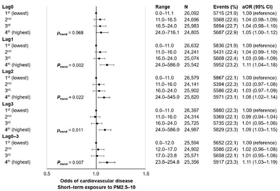 Figure 3 and Table S3 depicts the association of short-term PM2.5–10 exposure with CVD among cancer survivors. The 4th quartiles of lag0 (aOR 1.05, 95% CI 1.00–1.12), lag1 (aOR 1.11, 95% CI 1.04–1.18), lag2 (aOR 1.08, 95% CI 1.02–1.14), lag3 (aOR 1.09, 95% CI 1.03–1.15), and lag0–3 (aOR 1.11, 95% CI 1.03–1.19) PM2.5–10 were associated with higher CVD incidence compared to the respective 1st quartiles. Increasing quartiles of lag1, lag2, lag3, and lag0–3 PM2.5–10 were associated with higher CVD events (all p for trend <0.05).