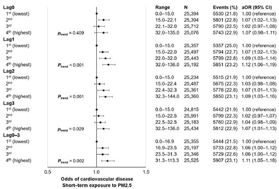 The short-term CVD odds according to PM2.5 are depicted in Figure 2 and Table S2. Compared to the lowest quartile of lag1 PM2.5 exposure, the 2nd (aOR 1.07, 95% CI 1.02–1.13), 3rd (aOR 1.09, 95% CI 1.03–1.14), and 4th (aOR 1.12, 95% CI 1.06–1.19) quartiles of lag1 PM2.5 were associated with higher odds for short-term CVD events. Similarly, 3rd (aOR 1.07, 95% CI 1.01–1.13) and 4th (aOR 1.09, 95% CI 1.03–1.16) quartiles of lag2 PM2.5 were associated with higher CVD event rates compared to the lowest quartile of lag2 PM2.5. The highest quartile of lag0-3 PM2.5 (aOR 1.11, 95% CI 1.05–1.18) had higher odds for CVD compared to the 1st quartile. Finally, increasing levels of lag1, lag2, lag3, and lag0–3 PM2.5 were associated with higher CVD events in a dose-responsive manner (all p for trend <0.05). There was a tendency towards higher CHD and stroke odds upon increasing levels of short-term PM2.5 exposure, as shown in Supplementary Table S3.