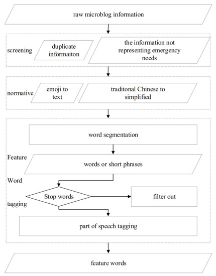 Data preprocessing includes preliminary screening, text format normalization, and feature word tagging. In the preliminary screening phase, the information that belongs to earthquake news and topics that are initiated by the public are filtered out. In the format normalization phase, some elements that make the word segmentation difficult are treated. For instance, the traditional Chinese is converted to simplified Chinese, emojis are converted to text, etc. In the feature word tagging phase, messages are segmented using the ICTCLAS Chinese lexical word segmentation system (http://ictclas.nlpir.org/, accessed on 10 September 2012) Microblog messages were divided into words or short phrases and tagged with nouns, verbs, or phrases that can better express the subjects [30]. Stop words were filtered out, while the left words or short phrases that have been marked, are referred to as feature words. The data preprocessing flowchart is illustrated in Figure 1.