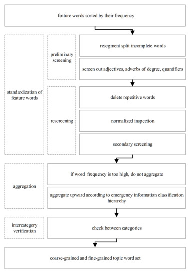 In Section 3, the feature words are divided according to the lowest level of earthquake emergency information classification hierarchy, which is a fine-grained set. Therefore, to meet the requirement of information collection, this paper focuses on a construction method for coarse-grained feature word sets. All kinds of fine-grained subject word sets, under the first-level category, are first merged together to form a new subject word set. The words with particularly low theme relevance are then eliminated, while aggregation processing is carried out on the same first-level category using the method shown in Equation (1). The verification steps are described in detail as follows:
