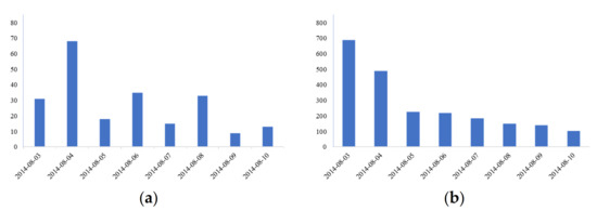 The coarse-grained subject word set is selected for the information collection experiment, while considering the data comprehensiveness and accuracy. Taking the most sensitive emergency rescue information in the earthquake emergency work as an example, the general topic crawler method b and the topic crawler method a, based on classified topic-words, are used to capture the messages from earthquakes that occurred a week later. Other conditions of the two comparative experiments are consistent. The Ludian earthquake was taken as an example for information collection. In method b, microblog messages were crawled by the “earthquake” keyword, while the message time is between 2014-08-03 00:00:00 and 2014-08-11 00:00:00, which includes the time at which the Ludian earthquake took place, as well as the seven days that followed. In method a, microblog messages were crawled by the first-level A5 words that are used in the coarse-grained word sets as keywords. The message validity is judged based on the earthquake rescue information. The experiment results are shown in Table 8. The daily number of microblog messages obtained by the two methods are shown in Figure 4. Earthquake emergencies are time-urgent and of great importance. Therefore, timeliness and accuracy are required for earthquake emergency information collection.