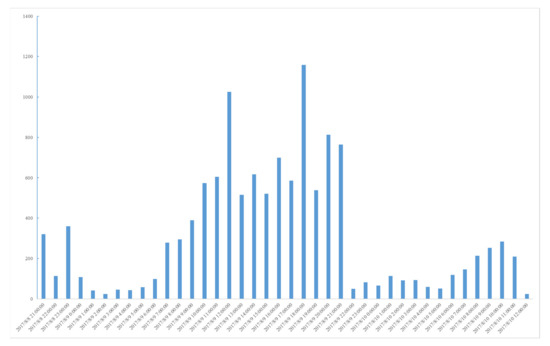 On 8 August 2017, Jiuzhaigou earthquake of magnitude 7.0, hit Sichuan Province in China. Its focal depth was 20 km. The earthquake case in this paper is called 05SC. This earthquake affected more than 0.17 million people, while most people in the disaster area, and out of it, wrote what they saw, heard, and felt on microblogs. Microblog message volume per hour is shown in Figure 5.