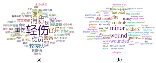 We crawled the messages released from earthquakes that occurred 72 h after 05SC based on the Sina platform. The coarse-grained word sets are used to collect the earthquake emergency information. There were 16,166 related messages in total. By detecting the topic-words from the microblog information of 05SC, the topic-word cloud and the high-frequency words are shown in Figure 6.