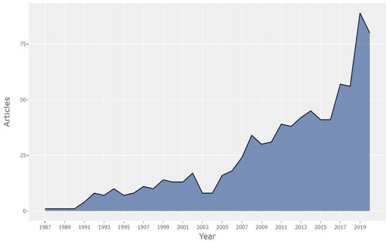 The descriptive characteristics of our sample is shown in Table 1. We found 823 papers published in 580 journals from 1987 to 2020. All articles used 1377 plus keywords (ID) and 1622 author’s keywords (DE). A total of 1764 authors wrote these papers, of which only 308 articles were written by a single author. Collaborative authorship is predominant in this research topic, as shown by the Collaboration Index, 2.85, or the ratio of papers per author (0.467).