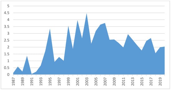 An analysis of citations per year (Figure 2) shows an increasing trend until 2006. Although the trend has been decreasing in the last decade, citations per year have averaged more than two.