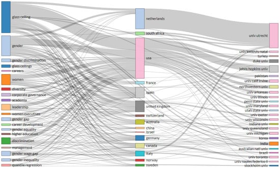 In addition to studying the scientific production and citations by year, it is worthwhile to explore the main topics, the countries where the articles have been published, and their authors’ affiliations. Figure 3 shows a three-way analysis with keywords on the left, countries in the middle, and affiliations on the right. It can be seen that the United States, in absolute terms, is the country that has published the most on all topics related to the glass ceiling, followed by the Netherlands, which has published mainly on the glass ceiling and gender. Other countries of particular relevance in all topics are Spain and the United Kingdom. The universities with the highest number of publications are Utrecht University, with collaborations with other universities in the United States, South Africa, Italy, and Johns Hopkins University.