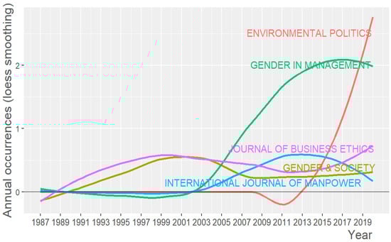 The journals analyzed are Gender in Management, Journal of Business Ethics, Gender & Society, International Journal of Manpower, and Environmental Politics. Since 2002, there has been an increase in the number of publications in Gender in Management, which is the main journal for publishing glass ceiling papers, although the number has decreased in recent years. In 2020, Environmental Politics was the journal with the highest value, being the journal with the highest growth since 2013. The Journal of Business Ethics has also seen significant growth over the last five years. Gender & Society remains the same, and the International Journal of Manpower has experienced a decrease in the number of papers published on the subject under study since 2013.