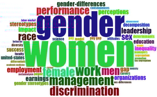 Figure 5 shows the cloud of the most frequent words, where the more significant the word is, the greater the frequency of use in the papers. As mentioned above, the words women and gender stand out. It should be noted that among the ten most frequent keywords, many terms could be considered synonyms, thus reinforcing the concept they represent. Therefore, the words “gender” and “sex” as well as “women” and “female” are found to be similar. Other studies point to “men” as a keyword closely related to the previous terms.