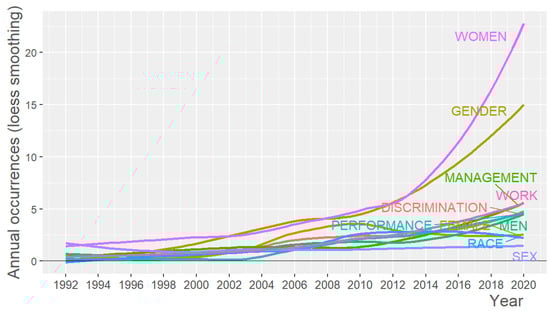 The analysis of the keywords is completed by analyzing their evolution over time (Figure 6). The graph was made using the Loess smoothing technique [40]. It can be seen in the graph that the use of the keywords that have been growing most, in parallel until 2013, has been “women” and “gender”. From 2014 onwards, “women” has been used more than “gender,” Its growth and use are much higher in the last three years. The word “female” began to decrease in use from 2009 onwards, with “men” also experiencing a slight decrease between 2010 and 2013. “Race” has experienced a drop in usage from 2015 onwards. The rest of the keywords have followed an upward trajectory.