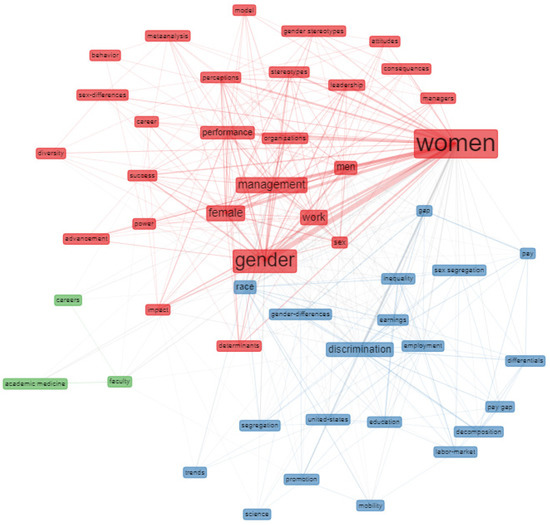 The main cluster is the red cluster, and the word “women” has a dominant position followed by “gender”, “management”, “work”, “female”, “men”, and “performance”. This implies that these keywords have served as important centers in the collaborative word network linking other keywords. The set of related words shows that glass ceiling researchers have focused their work on women’s problems in managerial positions in organizations. The results are consistent with Tekeli [10], who states that the phenomenon “glass ceiling” has been generally used in the literature on women workers. The blue cluster is dominated by “discrimination” and “race” followed by other themes such as “gender-differences”, “gap”, “pay”, “employments”, “earnings”, “education”, “promotion”, etc. This group of related words identifies research that has focused on analyzing the factors or causes that lead to the emergence of the “glass ceiling” phenomenon. Finally, the network of co-occurrences shows a third, smaller, green cluster that represents the studies that have been carried out on the glass ceiling in the academic world.