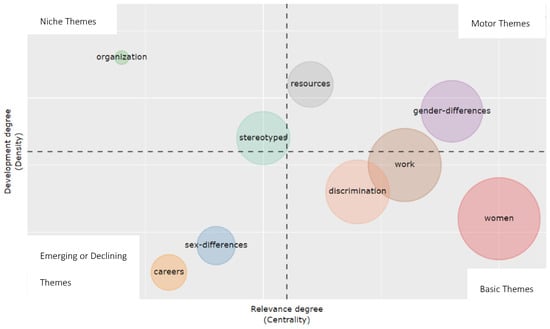 The research themes identified in the keyword co-occurrence relationship have been represented in a two-dimensional thematic map based on Callon et al. [62] density and centrality scores (Figure 8). The main domain refers to all issues related to women, work, and discrimination, and it is represented on the bottom right, with high centrality and low density. This means that these themes are essential and cross-cutting in all glass ceiling research. With a high level of centrality and density, the domain “gender differences” appears, which means that we can identify this theme as one of the driving themes of glass ceiling research, together with “resources”. The literature shows how the management levels of the organization do not offer the same resources to all people, with certain minorities facing barriers to occupying certain positions [63]. In quadrant four of the graph, the domain “stereotypes” is shown. This indicates that this theme is considered peripheral and with great potential of development. With a low level of both centrality and density, we identify the domains “careers” and “sex-differences.” These could be interpreted as emerging themes within glass ceiling research. Currently, more research is being done on the obstacles for certain minorities to make a career within the organization at all levels, not only the study of the glass ceiling at the managerial level.