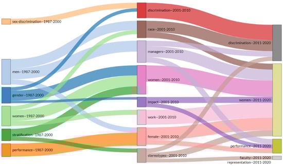In addition to the thematic map, there is the thematic evolution (Figure 9), which shows the historical development of the glass ceiling literature. This thematic evolution is analyzed based on the keyword plus. As can be seen, the thematic evolution can be divided into three main time segments. The first segment is from 1987 to 2000, the second is from 2001 to 2010, and the last is from 2011 to 2020. The topics have evolved over time. According to our results, in the first period, the literature on the glass ceiling is widely spread over several topics. However, the papers deal primarily with issues such as men, women, gender, and to a lesser extent, performance stratification and sex discrimination. In the second period, from 2001 to 2010, the most frequent themes are women and managers, followed by race and discrimination. This indicates that in this decade, the studies focus on the problems that lead to the emergence of the glass ceiling at the managerial level. Finally, between 2010 and 2020, the themes increasingly evolve toward women, discrimination, and performance.