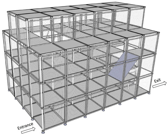The training facility utilized in this study was built by the NTFD. Figure 1 [24,25] shows a perspective view of the DCEs, the purpose of which is to train firefighters to face different obstacles in the DCEs, to simulate a fireground, and to test their ability to get out of trouble and escape confined spaces.