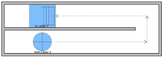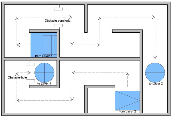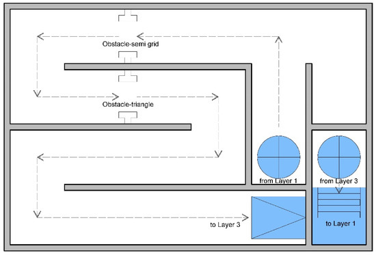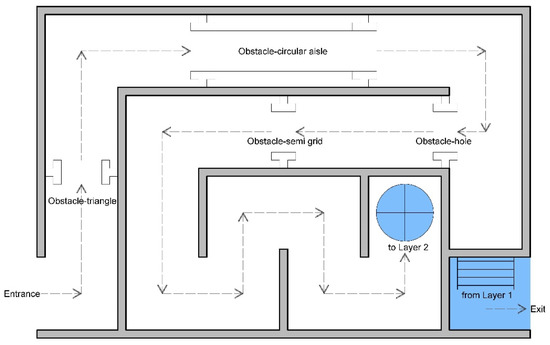 Simulated fire scenarios in the DCEs include many obstacles on the wayfinding path. Figure 2, Figure 3, Figure 4, Figure 5 and Figure 6 are legends and a floor plan showing the numerous simulation paths and obstacles installed inside the DCE training facility, such as ramps, stairs, round hole passages, triangles, circular aisles, holes, squares, and semi-grid obstacles. The plan of the DCE comprises four layers, each of which is assembled with a confined space unit (CSU) of 100 ± 2 cm The CSUs in Layers 1–3 are approximately 400 × 600 × 300 cm, and Layer 4 is an additional 200 × 600 × 100 cm (W × L × H). Layers 1–3 each have 24 CSUs and Layer 4 has 12 CSUs, giving a total of 84 CSUs. The paths can be modified for different situations to suit different firefighter wayfinding training objectives.