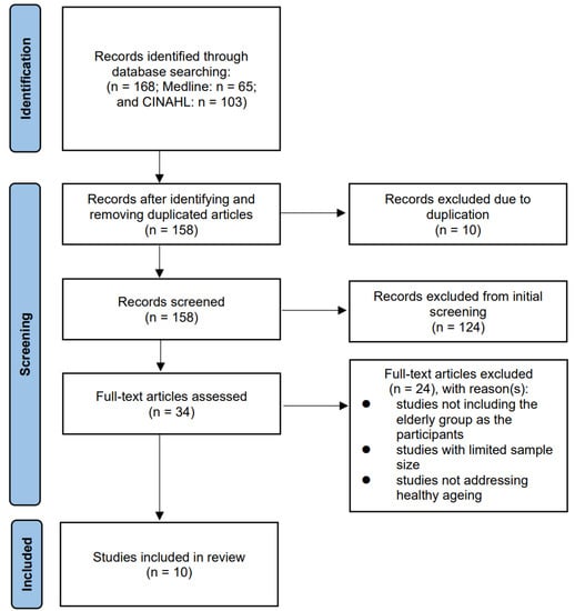 The selection process of relevant studies for this paper is summarised in Figure 1. The search strategy described in Section 2 identified 168 articles through the corresponding searches in two database systems. 10 duplicates were removed. After initial screening and further content review, 148 articles were removed considering the sample size, age group of participants and types of interventions. Consequently, 10 articles were included in this review [,,,,,,,,,]. The summary table of the 10 studies is given in Table 1.