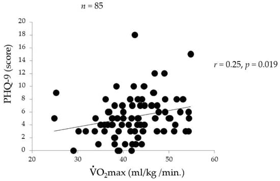 Figure 1, Figure 2 and Figure 3 indicate the associations between PHQ-9 and other variables. The PHQ-9 score was positively correlated with sleepiness (r = 0.35, p = 0.001, Figure 1) and the daily number of steps (r = 0.39, p < 0.001, Figure 2). The PHQ-9 score was also positively correlated with EEPA (r = 0.32, p = 0.005) but not with TEE (r = 0.15, p = 0.196). Moreover, the PHQ-9 score was positively correlated with O2max (r = 0.25, p = 0.019, Figure 3).