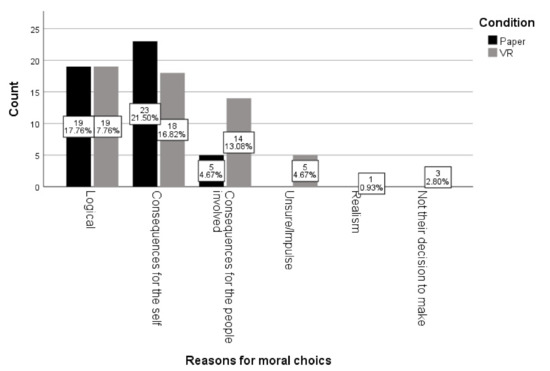 As shown in Figure 1, participants in the VR version gave “thinking about the consequences of the people involved” as an answer more than in the paper version. They also named “error/impulse” as a reason, whilst no one mentioned this in the paper version.