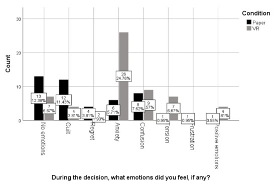 Regarding the question how difficult it was to make this choice, most people (36.2% paper, 26.7% VR) said that it was fairly difficult, with no significant differences between the conditions (X2(7) = 8.27, p = 0.31). In the paper version, 38.3% of participants said that their decision was intellectual, 40.4% said it was emotional, and 21.3% said it was a bit of both. Further, there was no significant difference to what people answered after the VR version on whether their decision was emotional, intellectual or a bit of both (41.7%; 21.7%; 36.7%) (X2(2) = 5.26, p = 0.07). However, when subsequently asked the next question to expand on this further, similarly to question one, participants in the VR condition showed a significantly different answer pattern (X2(7) = 14.34, p = 0.045), again mentioning thinking about the consequences of the people involves, their relatedness to the people, error/impulse more than on the paper version. Furthermore, there was a significant difference in the self-reported emotions for the paper and the VR version (X2(7) = 25.10, p = 0.001) (See Figure 2).